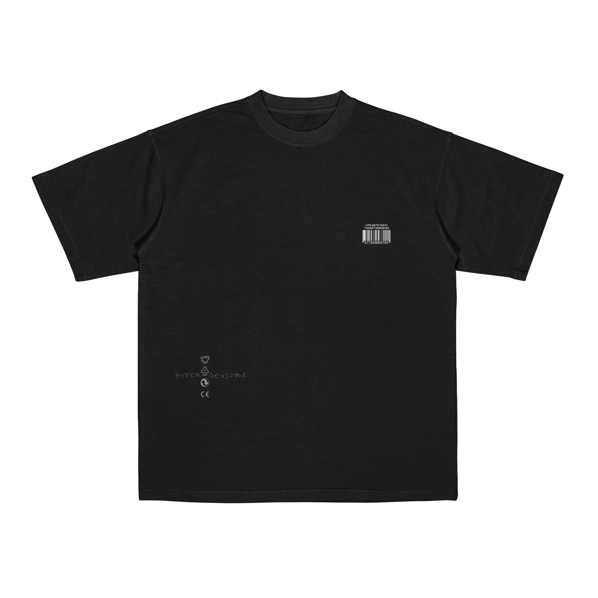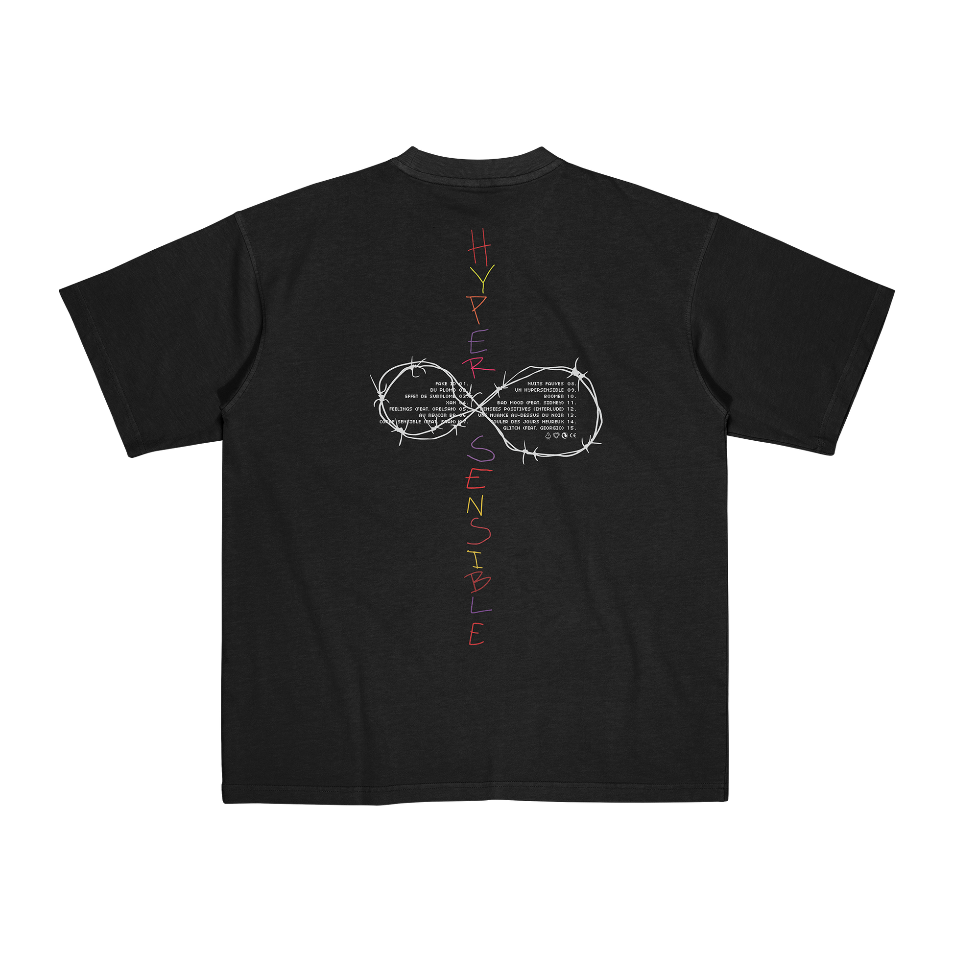 - Le T-shirt noir Hypersensible, coupe unisexe, transfert numérique devant et dos (en coton bio, 4 tailles au choix dans la limite des stocks disponibles)